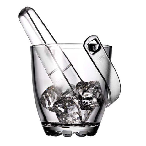 Hielera de vidrio liso con asa y pinza para hielo en policarbonato. Capacidad 830 ml. 7.5 cms base x 11.8 cms diámetro X 12.2 cms alto. Pinza (14.8×2.1)