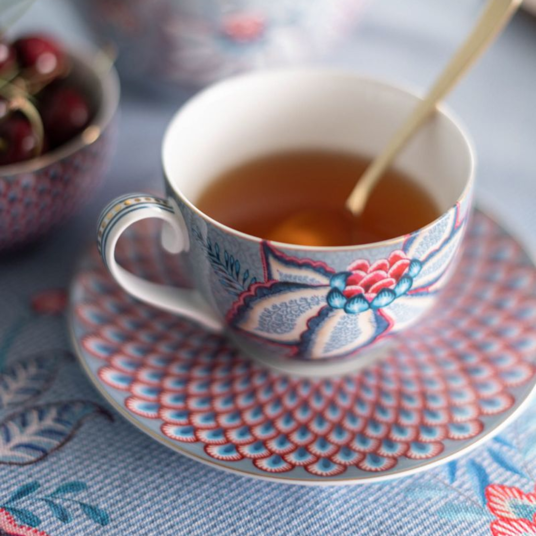 SET X2 TAZAS Y PLATOS FLOWER FESTIVAL AZUL CLARO