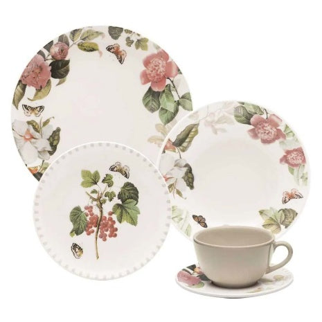 Vajilla en cerámica 20 pzas 4 puestos, compuestas por 4 platos llanos, 4 plato hondos, 4 platos postres, 4 sets de taza (200 ml) con plato. Llano 26 cms- hondo 20.5 cms – postre 20 cms – platillo 14 cms